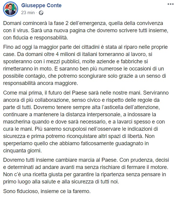 Questo quanto apprendiamo dalla pagina facebook del Premier Conte: