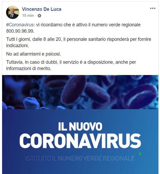 Questo quanto comunicato sulla propria pagina FB dal Governatore De Luca
