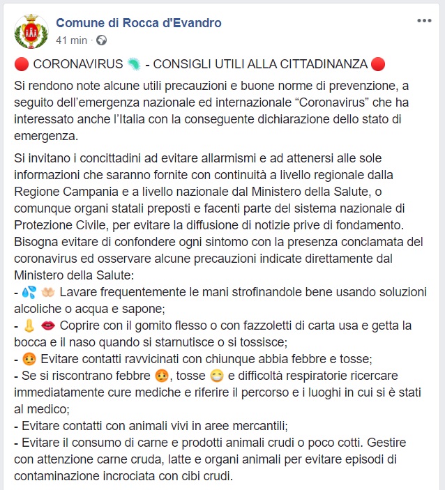 Questi i consigli per i cittadini in merito al coronavirus che apprendiamo dalla pagina del Comune di Rocca d'Evandro