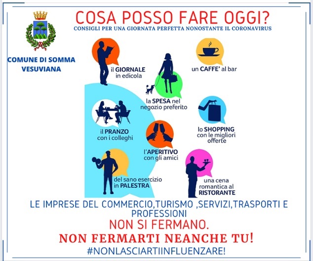 Vincere la psicosi da Coronavirus è possibile con semplici gesti quotidiani, per farsì che si ritorni alla normalità. E' la campagna lanciata dal Comune di Somma Vesuviana che ha sottolineato come neppure in questo periodo le imprese del commercio, del turismo, dei servizi, dei trasporti e le professioni si fermano.