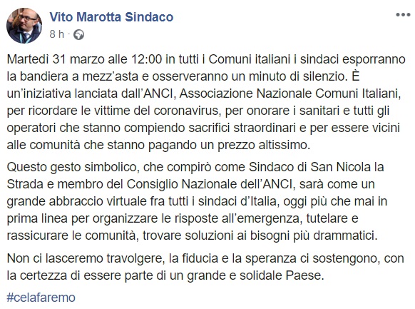 Questo quanto apprendiamo dalla pagina facebook del Sindaco di SNLS Marotta:
