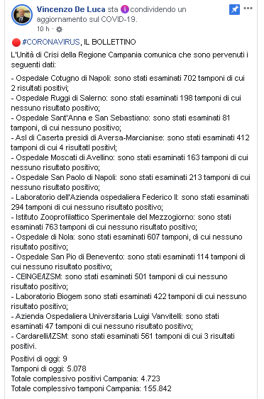 Lo apprendiamo dalla pagina Facebook, del Governatore della Regione Campania, Vincenzo De Luca: