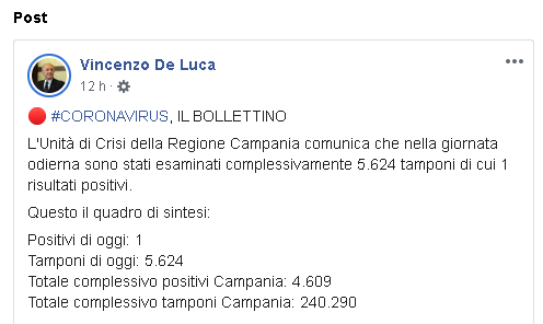 Lo apprendiamo dalla pagina Facebook del Governatore della Regione Campania, Vincenzo De Luca: