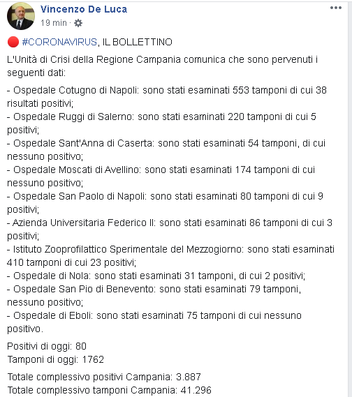 Lo apprendiamo dalla pagina Facwbook del Governatore della Regione Campania, Vincenzo De Luca: