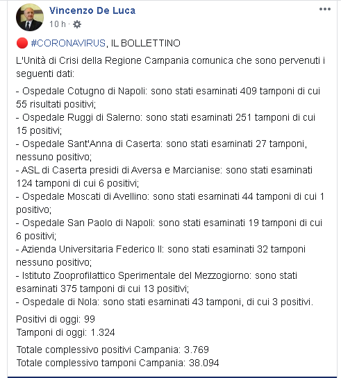 Lo apprendiamo dalla pagina Facebook del Governatore della Regione Campania, Vincenzo De Luca: