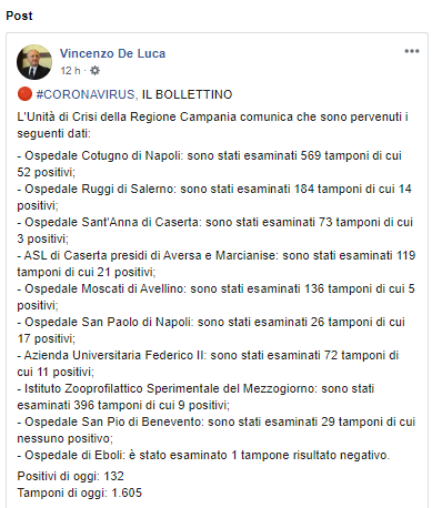 Lo apprendiamo dalla pagina Facebook del Governatore della Regione Campania, Vincenzo De Luca: