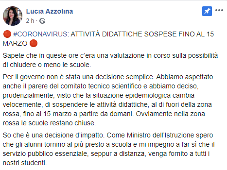 Sapete che in queste ore c’era una valutazione in corso sulla possibilità di chiudere o meno le scuole. Per il governo non è stata una decisione semplice. Abbiamo aspettato anche il parere del comitato tecnico scientifico e abbiamo deciso, prudenzialmente, visto che la situazione epidemiologica cambia velocemente, di sospendere le attività didattiche, al di fuori della zona rossa, fino al 15 marzo a partire da domani. Ovviamente nella zona rossa le scuole restano chiuse. So che è una decisione d’impatto. Come Ministro dell’Istruzione spero che gli alunni tornino al più presto a scuola e mi impegno a far sì che il servizio pubblico essenziale, seppur a distanza, venga fornito a tutti i nostri studenti."