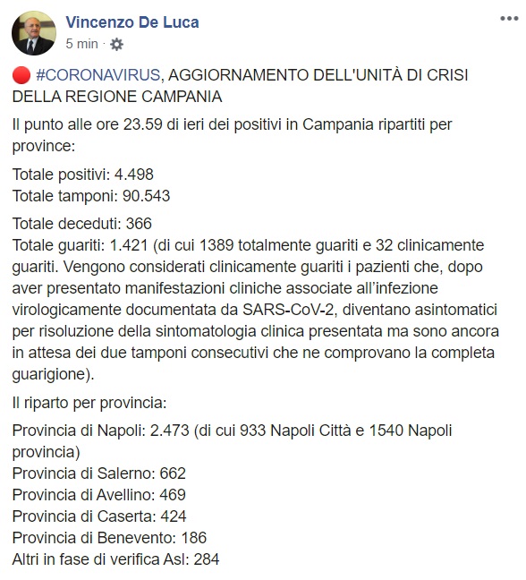Questo quanto pubblicato sulla pagina facebook del Pres. Vincenzo De Luca:
