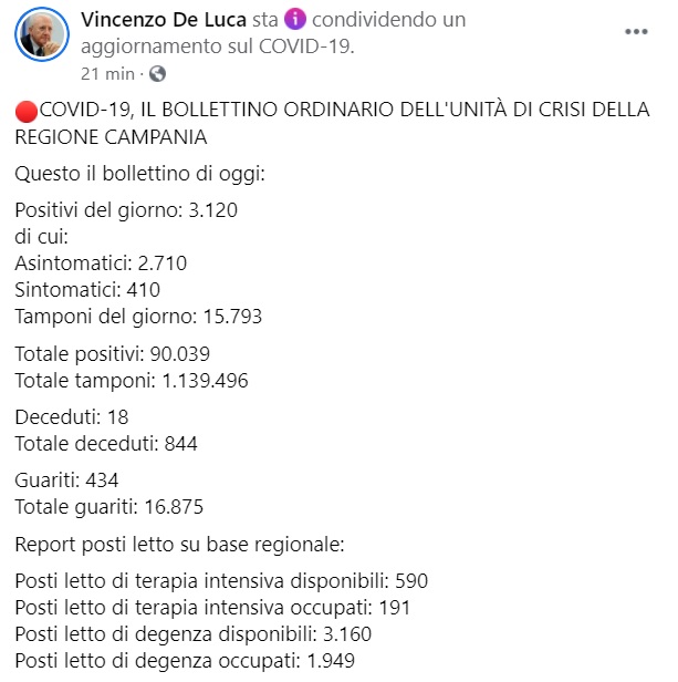 Questo quanto pubblicato sulla pagina facebook del Pres. De Luca: