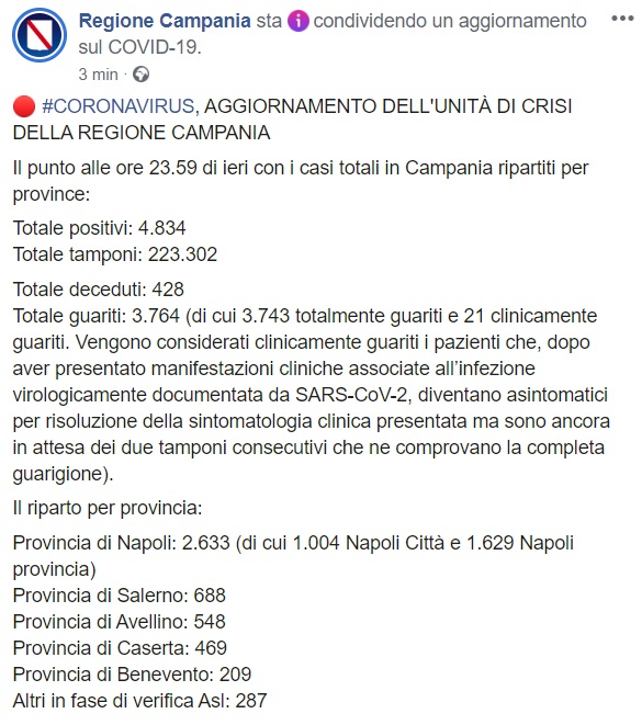 Questo quanto apprendiamo dalla pagina facebook della Regione Campania: