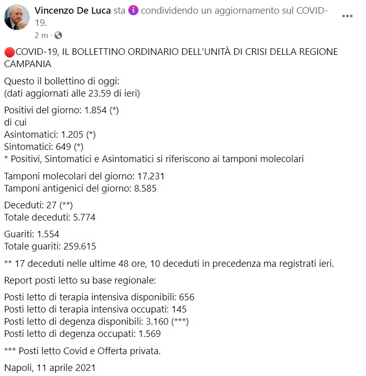Questo quanto apprendiamo dalla pagina facebook del Pres. De Luca:
