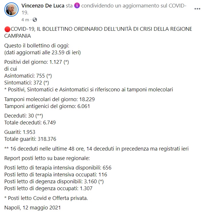 Questo quanto apprendiamo dalla pagina facebook del Pres. De Luca: