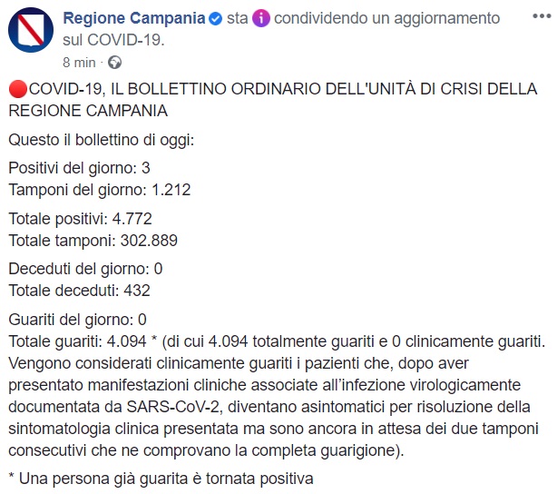 Questo quanto apprendiamo dalla pagina facebook della Regione Campania: