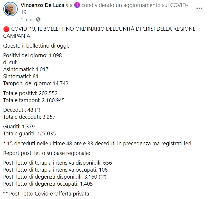 Questo quanto apprendiamo dalla pagina facebook del Pres. De Luca: