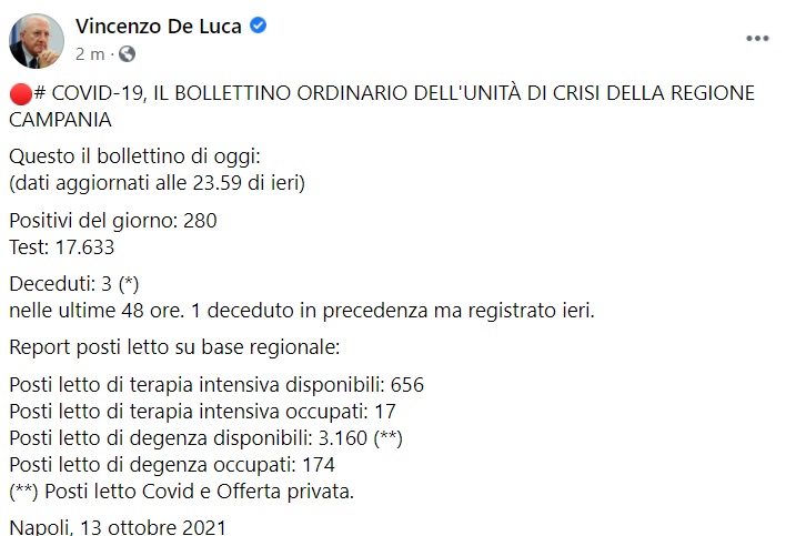 "#COVID-19, IL BOLLETTINO ORDINARIO DELL'UNITÀ DI CRISI DELLA REGIONE CAMPANIA Questo il bollettino di oggi: (dati aggiornati alle 23.59 di ieri) Positivi del giorno: 280 Test: 17.633 Deceduti: 3 (*) nelle ultime 48 ore. 1 deceduto in precedenza ma registrato ieri. Report posti letto su base regionale: Posti letto di terapia intensiva disponibili: 656 Posti letto di terapia intensiva occupati: 17 Posti letto di degenza disponibili: 3.160 (**) Posti letto di degenza occupati: 174 (**) Posti letto Covid e Offerta privata."