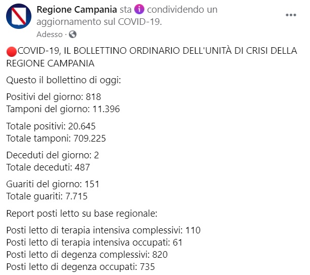 Questo quanto apprendiamo dalla pagina facebook della Regione Campania: