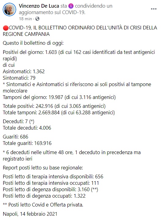 "COVID-19, IL BOLLETTINO ORDINARIO DELL'UNITÀ DI CRISI DELLA REGIONE CAMPANIA. Questo il bollettino di oggi: Positivi del giorno: 1.603 (di cui 162 casi identificati da test antigenici rapidi) di cui Asintomatici: 1.362, Sintomatici: 79 * Sintomatici e Asintomatici si riferiscono ai soli positivi al tampone molecolare. Tamponi del giorno: 19.987 (di cui 3.116 antigenici). Totale positivi: 242.916 (di cui 3.065 antigenici). Totale tamponi: 2.669.884 (di cui 63.288 antigenici). Deceduti: 7 (*). Totale deceduti: 4.006. Guariti: 686. Totale guariti: 169.916 * 6 deceduti nelle ultime 48 ore, 1 deceduto in precedenza ma registrato ieri. Report posti letto su base regionale: Posti letto di terapia intensiva disponibili: 656. Posti letto di terapia intensiva occupati: 111. Posti letto di degenza disponibili: 3.160 (**). Posti letto di degenza occupati: 1.322 ** Posti letto Covid e Offerta privata."
