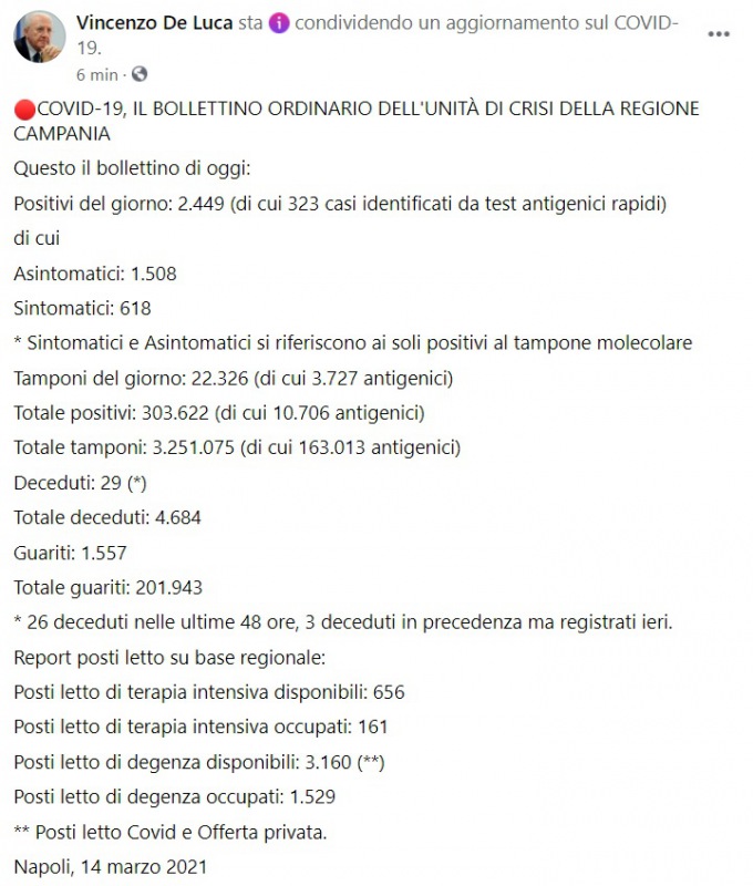 "COVID-19, IL BOLLETTINO ORDINARIO DELL'UNITÀ DI CRISI DELLA REGIONE CAMPANIA. Questo il bollettino di oggi: Positivi del giorno: 2.449 (di cui 323 casi identificati da test antigenici rapidi) di cui Asintomatici: 1.508 Sintomatici: 618 * Sintomatici e Asintomatici si riferiscono ai soli positivi al tampone molecolare Tamponi del giorno: 22.326 (di cui 3.727 antigenici) Totale positivi: 303.622 (di cui 10.706 antigenici) Totale tamponi: 3.251.075 (di cui 163.013 antigenici)%u200B %u200BDeceduti: 29 (*)%u200B Totale deceduti: 4.684 Guariti: 1.557 Totale guariti: 201.943 * 26 deceduti nelle ultime 48 ore, 3 deceduti in precedenza ma registrati ieri. %u200BReport posti letto su base regionale: Posti letto di terapia intensiva disponibili: 656 Posti letto di terapia intensiva occupati: 161 Posti letto di degenza disponibili: 3.160 (**) Posti letto di degenza occupati: 1.529 ** Posti letto Covid e Offerta privata."