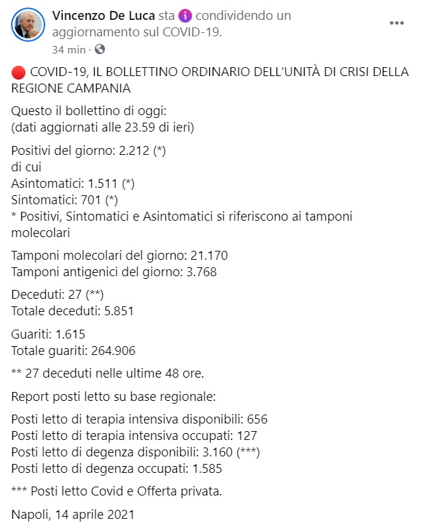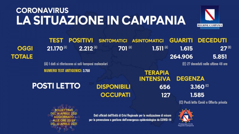"COVID-19, IL BOLLETTINO ORDINARIO DELL'UNITÀ DI CRISI DELLA REGIONE CAMPANIA Questo il bollettino di oggi: (dati aggiornati alle 23.59 di ieri) Positivi del giorno: 2.212 (*) di cui Asintomatici: 1.511 (*) Sintomatici: 701 (*) * Positivi, Sintomatici e Asintomatici si riferiscono ai tamponi molecolari Tamponi molecolari del giorno: 21.170 Tamponi antigenici del giorno: 3.768 Deceduti: 27 (**) Totale deceduti: 5.851 Guariti: 1.615 Totale guariti: 264.906 ** 27 deceduti nelle ultime 48 ore. Report posti letto su base regionale: Posti letto di terapia intensiva disponibili: 656 Posti letto di terapia intensiva occupati: 127 Posti letto di degenza disponibili: 3.160 (***) Posti letto di degenza occupati: 1.585 *** Posti letto Covid e Offerta privata."