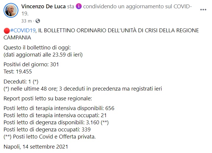 Questo quanto apprendiamo dalla pagina facebook del Pres. De Luca: