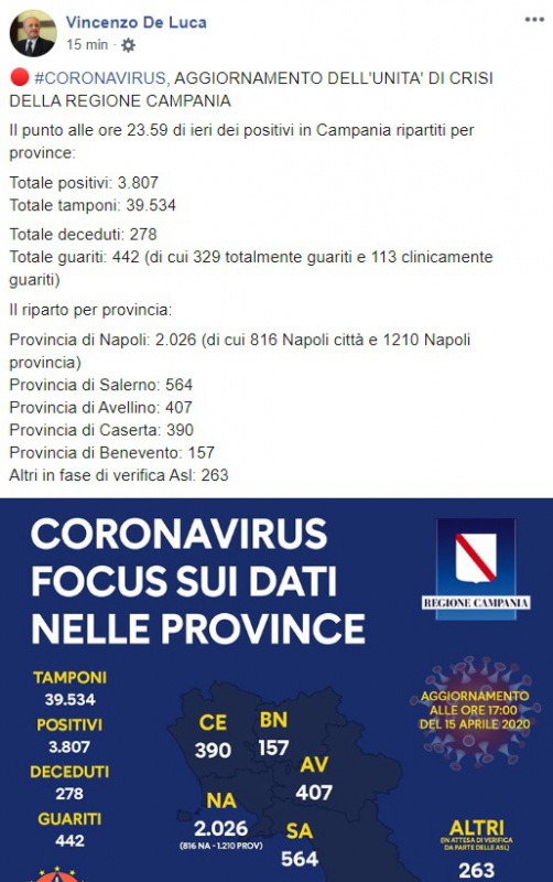 Questo quanto apprendiamo dalla pagina facebook del Pres. De Luca: