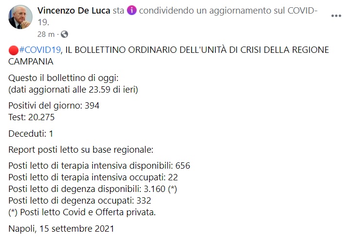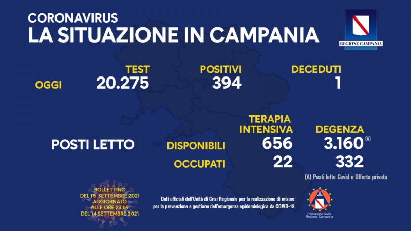 "#COVID19, IL BOLLETTINO ORDINARIO DELL'UNITÀ DI CRISI DELLA REGIONE CAMPANIA. Questo il bollettino di oggi: (dati aggiornati alle 23.59 di ieri) Positivi del giorno: 394 Test: 20.275 Deceduti: 1 Report posti letto su base regionale: Posti letto di terapia intensiva disponibili: 656 Posti letto di terapia intensiva occupati: 22 Posti letto di degenza disponibili: 3.160 (*) Posti letto di degenza occupati: 332 (*) Posti letto Covid e Offerta privata."