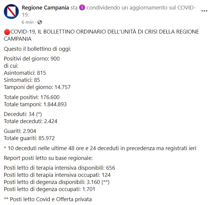 Questo quanto apprendiamo dalla pagina facebook della Regione Campania: