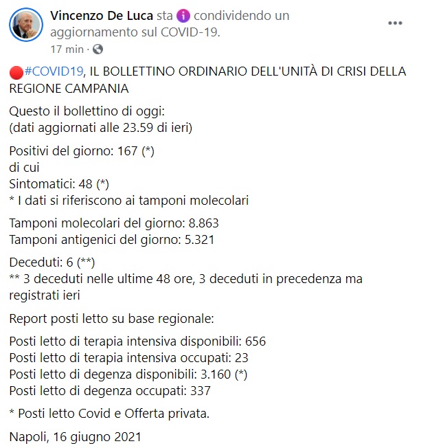 "#COVID19, IL BOLLETTINO ORDINARIO DELL'UNITÀ DI CRISI DELLA REGIONE CAMPANIA. Questo il bollettino di oggi: (dati aggiornati alle 23.59 di ieri) Positivi del giorno: 167 (*) di cui Sintomatici: 48 (*) * I dati si riferiscono ai tamponi molecolari Tamponi molecolari del giorno: 8.863 Tamponi antigenici del giorno: 5.321 Deceduti: 6 (**) ** 3 deceduti nelle ultime 48 ore, 3 deceduti in precedenza ma registrati ieri Report posti letto su base regionale: Posti letto di terapia intensiva disponibili: 656 Posti letto di terapia intensiva occupati: 23 Posti letto di degenza disponibili: 3.160 (*) Posti letto di degenza occupati: 337 * Posti letto Covid e Offerta privata."