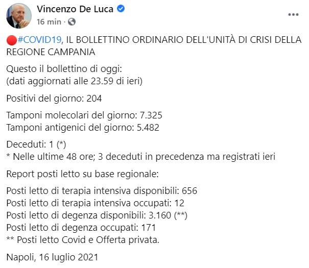 "#COVID19, IL BOLLETTINO ORDINARIO DELL'UNITÀ DI CRISI DELLA REGIONE CAMPANIA. Questo il bollettino di oggi: (dati aggiornati alle 23.59 di ieri) Positivi del giorno: 204 Tamponi molecolari del giorno: 7.325 Tamponi antigenici del giorno: 5.482 Deceduti: 1 (*) * Nelle ultime 48 ore; 3 deceduti in precedenza ma registrati ieri Report posti letto su base regionale: Posti letto di terapia intensiva disponibili: 656 Posti letto di terapia intensiva occupati: 12 Posti letto di degenza disponibili: 3.160 (**) Posti letto di degenza occupati: 171 ** Posti letto Covid e Offerta privata."