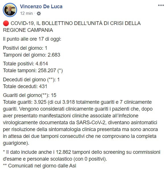 Questo quanto apprendiamo dalla pagina facebook del Pres. De Luca: