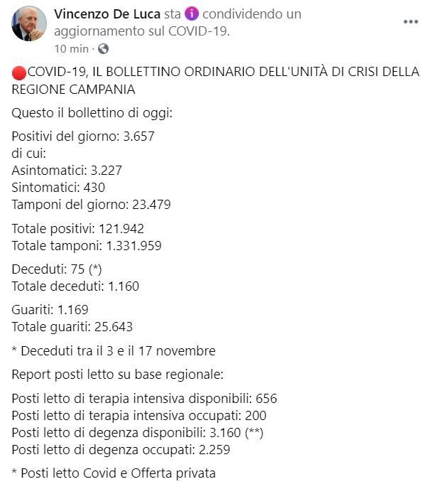 Questo quanto apprendiamo dalla pagina facebook del Pres. De Luca: