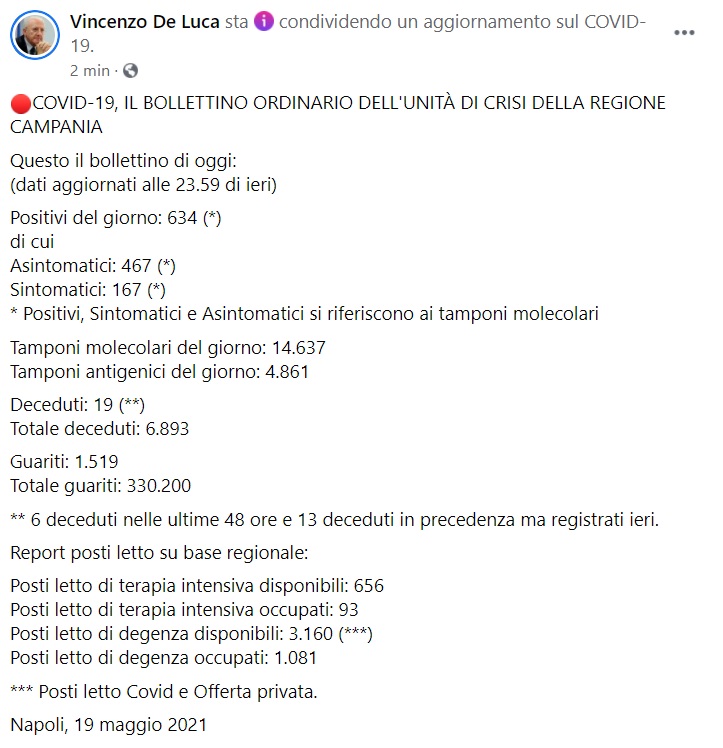 "COVID-19, IL BOLLETTINO ORDINARIO DELL'UNITÀ DI CRISI DELLA REGIONE CAMPANIA. Questo il bollettino di oggi: (dati aggiornati alle 23.59 di ieri) Positivi del giorno: 634 (*) di cui Asintomatici: 467 (*) Sintomatici: 167 (*) * Positivi, Sintomatici e Asintomatici si riferiscono ai tamponi molecolari Tamponi molecolari del giorno: 14.637 Tamponi antigenici del giorno: 4.861 Deceduti: 19 (**) Totale deceduti: 6.893 Guariti: 1.519 Totale guariti: 330.200 ** 6 deceduti nelle ultime 48 ore e 13 deceduti in precedenza ma registrati ieri. Report posti letto su base regionale: Posti letto di terapia intensiva disponibili: 656 Posti letto di terapia intensiva occupati: 93 Posti letto di degenza disponibili: 3.160 (***) Posti letto di degenza occupati: 1.081 *** Posti letto Covid e Offerta privata."