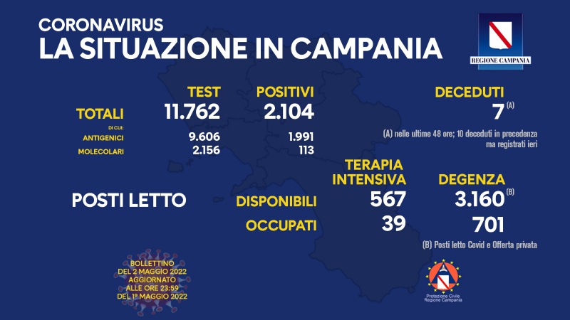 Questo il bollettino di oggi: (dati aggiornati alle 23.59 di ieri) Positivi del giorno: 2.104 di cui: Positivi all'antigenico: 1.991 Positivi al molecolare: 113 Test: 11.762 di cui: Antigenici: 9.606 Molecolari: 2.156 Deceduti: 7 (*) nelle ultime 48 ore; 10 deceduti in precedenza ma- si legge nella nota- registrati ieri. Report posti letto su base regionale: Posti letto di terapia intensiva disponibili: 567 Posti letto di terapia intensiva occupati: 39 Posti letto di degenza disponibili: 3.160 (*) Posti letto di degenza occupati: 701 (*) Posti letto Covid e Offerta privata. I dati sulle vaccinazioni sono disponibili al link: http://vaccinicovid19.regione.campania.it/e_vaccini-anti..."