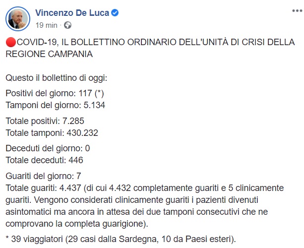 Questo quanto apprendiamo dalla pagina facbook del Pres. De Luca: