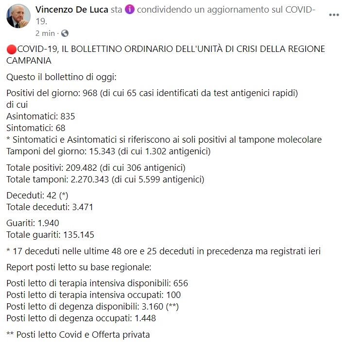 Questo quanto apprendiamo dalla pagina facebook del Pres. De Luca: