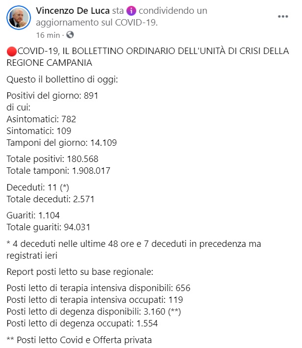 Questo quanto apprendiamo dalla pagina facebook del Pres. De Luca:
