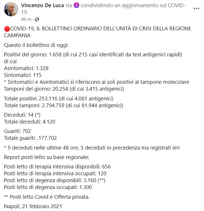 "COVID-19, IL BOLLETTINO ORDINARIO DELL'UNITÀ DI CRISI DELLA REGIONE CAMPANIA. Questo il bollettino di oggi: Positivi del giorno: 1.658 (di cui 215 casi identificati da test antigenici rapidi) di cui Asintomatici: 1.328 Sintomatici: 115 * Sintomatici e Asintomatici si riferiscono ai soli positivi al tampone molecolare Tamponi del giorno: 20.254 (di cui 3.415 antigenici) Totale positivi: 253.116 (di cui 4.081 antigenici) Totale tamponi: 2.794.759 (di cui 81.944 antigenici) Deceduti: 14 (*) Totale deceduti: 4.120 Guariti: 702 Totale guariti: .177.702 * 9 deceduti nelle ultime 48 ore, 5 deceduti in precedenza ma registrati ieri Report posti letto su base regionale: Posti letto di terapia intensiva disponibili: 656 Posti letto di terapia intensiva occupati: 120 Posti letto di degenza disponibili: 3.160 (**) Posti letto di degenza occupati: 1.300 ** Posti letto Covid e Offerta privata."