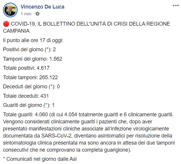 Questo quanto apprendiamo dalla pagina facebook del Pres. De Luca: