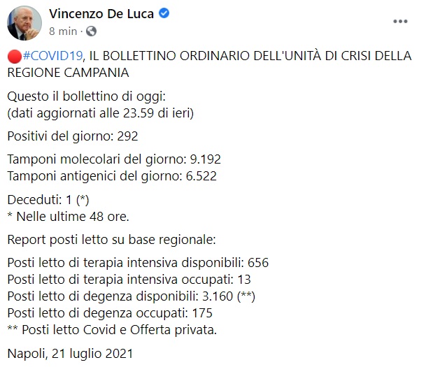 "#COVID19, IL BOLLETTINO ORDINARIO DELL'UNITÀ DI CRISI DELLA REGIONE CAMPANIA. Questo il bollettino di oggi: (dati aggiornati alle 23.59 di ieri) Positivi del giorno: 292 Tamponi molecolari del giorno: 9.192 Tamponi antigenici del giorno: 6.522 Deceduti: 1 (*) * Nelle ultime 48 ore. Report posti letto su base regionale: Posti letto di terapia intensiva disponibili: 656 Posti letto di terapia intensiva occupati: 13 Posti letto di degenza disponibili: 3.160 (**) Posti letto di degenza occupati: 175 ** Posti letto Covid e Offerta privata."
