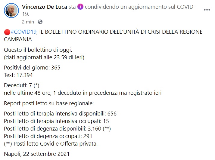 "#COVID19, IL BOLLETTINO ORDINARIO DELL'UNITÀ DI CRISI DELLA REGIONE CAMPANIA Questo il bollettino di oggi: (dati aggiornati alle 23.59 di ieri) Positivi del giorno: 365 Test: 17.394 Deceduti: 7 (*) nelle ultime 48 ore; 1 deceduto in precedenza ma registrato ieri Report posti letto su base regionale: Posti letto di terapia intensiva disponibili: 656 Posti letto di terapia intensiva occupati: 15 Posti letto di degenza disponibili: 3.160 (**) Posti letto di degenza occupati: 291 (**) Posti letto Covid e Offerta privata."