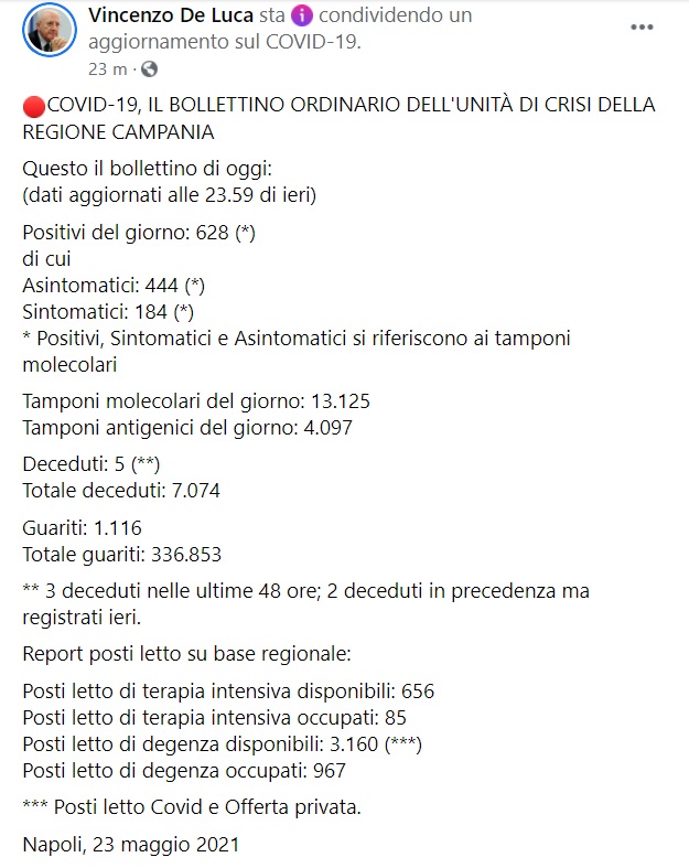"COVID-19, IL BOLLETTINO ORDINARIO DELL'UNITÀ DI CRISI DELLA REGIONE CAMPANIA. Questo il bollettino di oggi: (dati aggiornati alle 23.59 di ieri) Positivi del giorno: 628 (*) di cui Asintomatici: 444 (*) Sintomatici: 184 (*) * Positivi, Sintomatici e Asintomatici si riferiscono ai tamponi molecolari Tamponi molecolari del giorno: 13.125 Tamponi antigenici del giorno: 4.097 Deceduti: 5 (**) Totale deceduti: 7.074 Guariti: 1.116 Totale guariti: 336.853 ** 3 deceduti nelle ultime 48 ore; 2 deceduti in precedenza ma registrati ieri. Report posti letto su base regionale: Posti letto di terapia intensiva disponibili: 656 Posti letto di terapia intensiva occupati: 85 Posti letto di degenza disponibili: 3.160 (***) Posti letto di degenza occupati: 967 *** Posti letto Covid e Offerta privata."