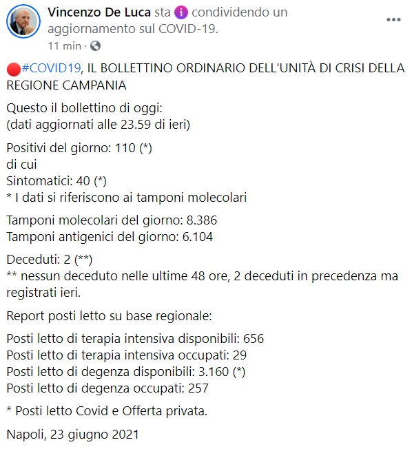 "#COVID19, IL BOLLETTINO ORDINARIO DELL'UNITÀ DI CRISI DELLA REGIONE CAMPANIA. Questo il bollettino di oggi: (dati aggiornati alle 23.59 di ieri) Positivi del giorno: 110 (*) di cui Sintomatici: 40 (*) * I dati si riferiscono ai tamponi molecolari Tamponi molecolari del giorno: 8.386 Tamponi antigenici del giorno: 6.104 Deceduti: 2 (**) ** nessun deceduto nelle ultime 48 ore, 2 deceduti in precedenza ma registrati ieri. Report posti letto su base regionale: Posti letto di terapia intensiva disponibili: 656 Posti letto di terapia intensiva occupati: 29 Posti letto di degenza disponibili: 3.160 (*) Posti letto di degenza occupati: 257 * Posti letto Covid e Offerta privata."
