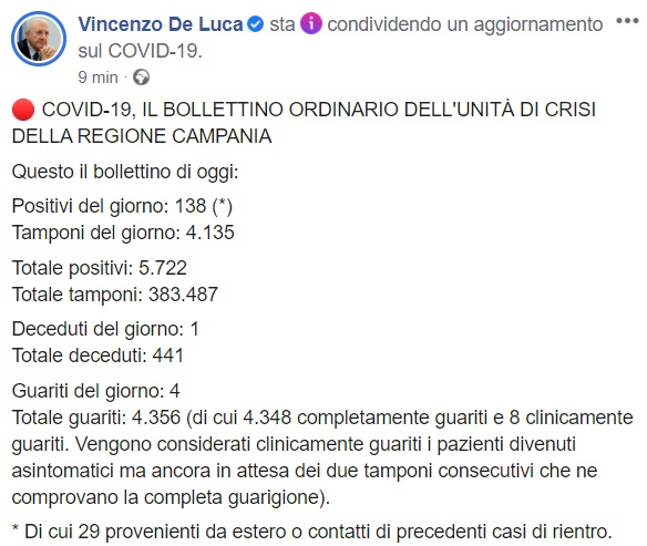 Questo quanto apprendiamo dalla pagina facebook del Pres. De Luca: