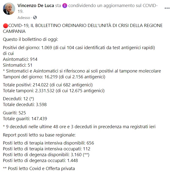 Questo quanto apprendiamo dalla pagina facebook del Pres. De Luca: