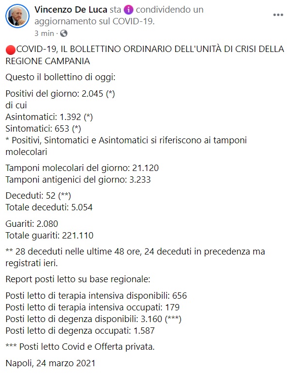 "COVID-19, IL BOLLETTINO ORDINARIO DELL'UNITÀ DI CRISI DELLA REGIONE CAMPANIA Questo il bollettino di oggi: Positivi del giorno: 2.045 (*) di cui Asintomatici: 1.392 (*) Sintomatici: 653 (*) * Positivi, Sintomatici e Asintomatici si riferiscono ai tamponi molecolari Tamponi molecolari del giorno: 21.120 Tamponi antigenici del giorno: 3.233 Deceduti: 52 (**) Totale deceduti: 5.054 Guariti: 2.080 Totale guariti: 221.110 ** 28 deceduti nelle ultime 48 ore, 24 deceduti in precedenza ma registrati ieri. Report posti letto su base regionale: Posti letto di terapia intensiva disponibili: 656 Posti letto di terapia intensiva occupati: 179 Posti letto di degenza disponibili: 3.160 (***) Posti letto di degenza occupati: 1.587 *** Posti letto Covid e Offerta privata."