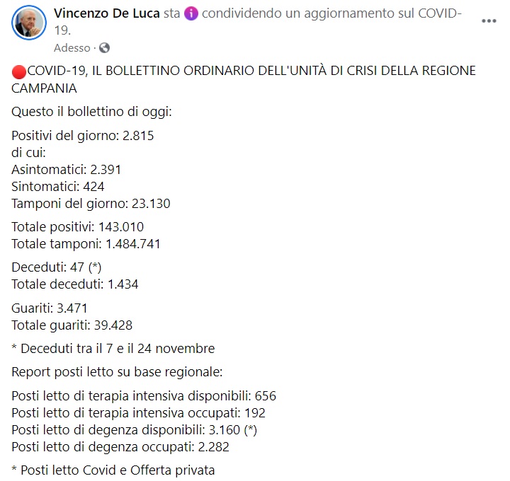 Questo quanto apprendiamo dalla pagina facebook del Pres. De Luca: