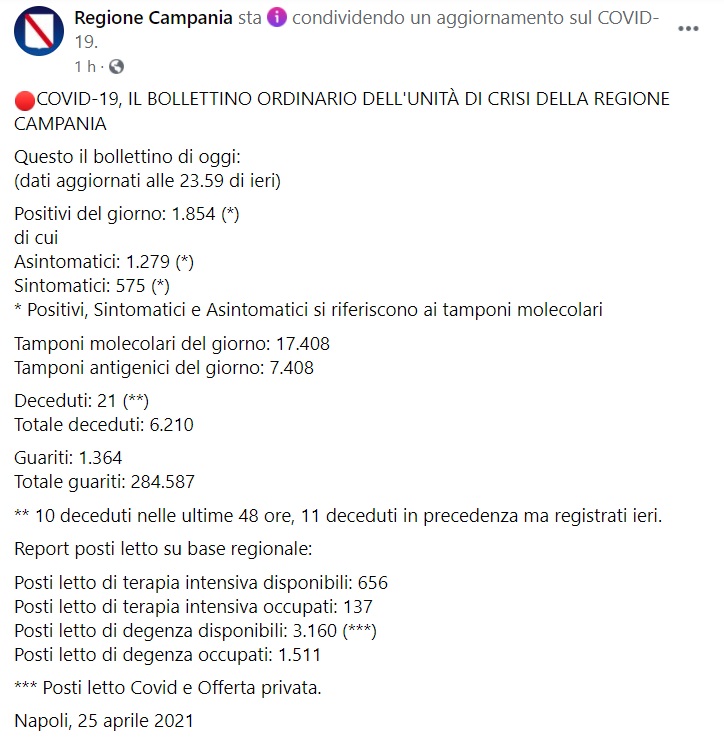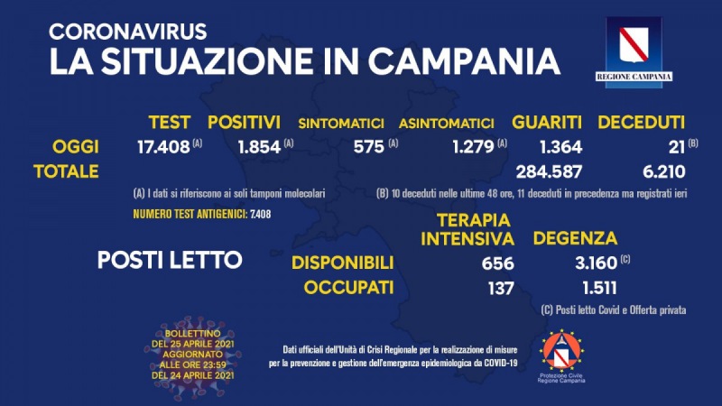 "COVID-19, IL BOLLETTINO ORDINARIO DELL'UNITÀ DI CRISI DELLA REGIONE CAMPANIA. Questo il bollettino di oggi: (dati aggiornati alle 23.59 di ieri) Positivi del giorno: 1.854 (*) di cui Asintomatici: 1.279 (*) Sintomatici: 575 (*) * Positivi, Sintomatici e Asintomatici si riferiscono ai tamponi molecolari Tamponi molecolari del giorno: 17.408 Tamponi antigenici del giorno: 7.408 Deceduti: 21 (**) Totale deceduti: 6.210 Guariti: 1.364 Totale guariti: 284.587 ** 10 deceduti nelle ultime 48 ore, 11 deceduti in precedenza ma registrati ieri. Report posti letto su base regionale: Posti letto di terapia intensiva disponibili: 656 Posti letto di terapia intensiva occupati: 137 Posti letto di degenza disponibili: 3.160 (***) Posti letto di degenza occupati: 1.511 *** Posti letto Covid e Offerta privata."