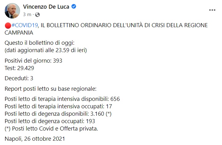 "#COVID19, IL BOLLETTINO ORDINARIO DELL'UNITÀ DI CRISI DELLA REGIONE CAMPANIA Questo il bollettino di oggi: (dati aggiornati alle 23.59 di ieri) Positivi del giorno: 393 Test: 29.429 Deceduti: 3 Report posti letto su base regionale: Posti letto di terapia intensiva disponibili: 656 Posti letto di terapia intensiva occupati: 17 Posti letto di degenza disponibili: 3.160 (*) Posti letto di degenza occupati: 193 (*) Posti letto Covid e Offerta privata."