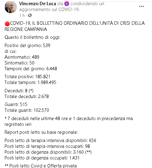 Lo apprendiamo dalla pagina Facebook del Presidente della Regione Campania, Vincenzo De Luca.