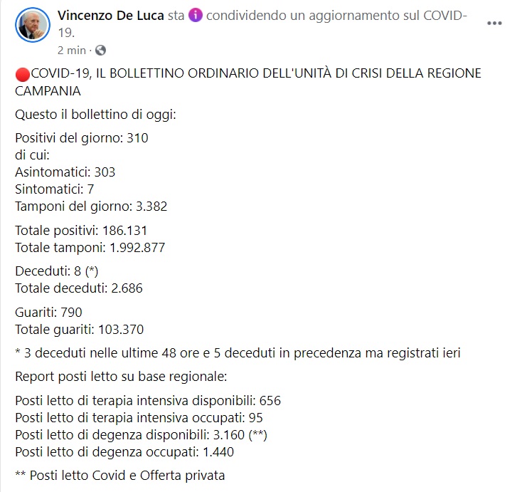 Questo quanto apprendiamo dalla pagina facebook del Pres. De Luca: